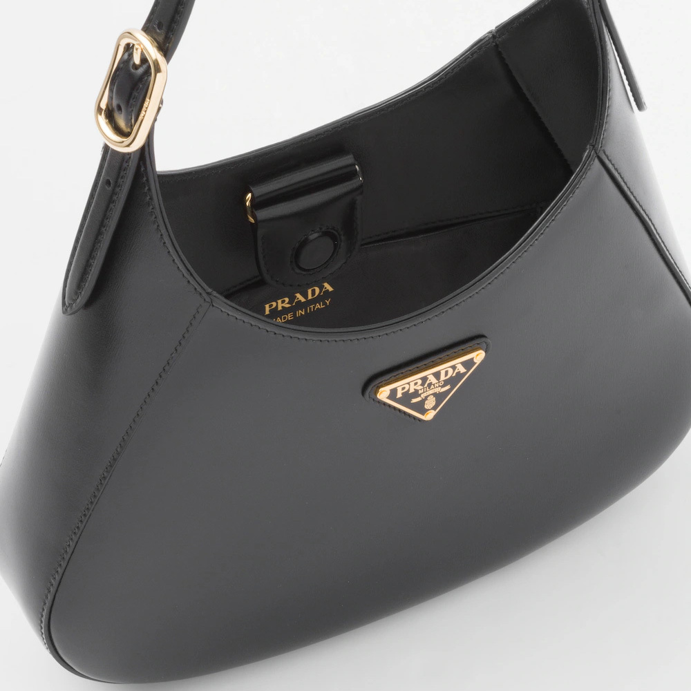A bold and refined silhouette characterizes this leather shoulder bag with fine details. The geometric construction contrasts with soft lines to create a modern and elegant yet sporty bag, an expression of the hybrid concept and part of the Prthtada's aesthetic code.