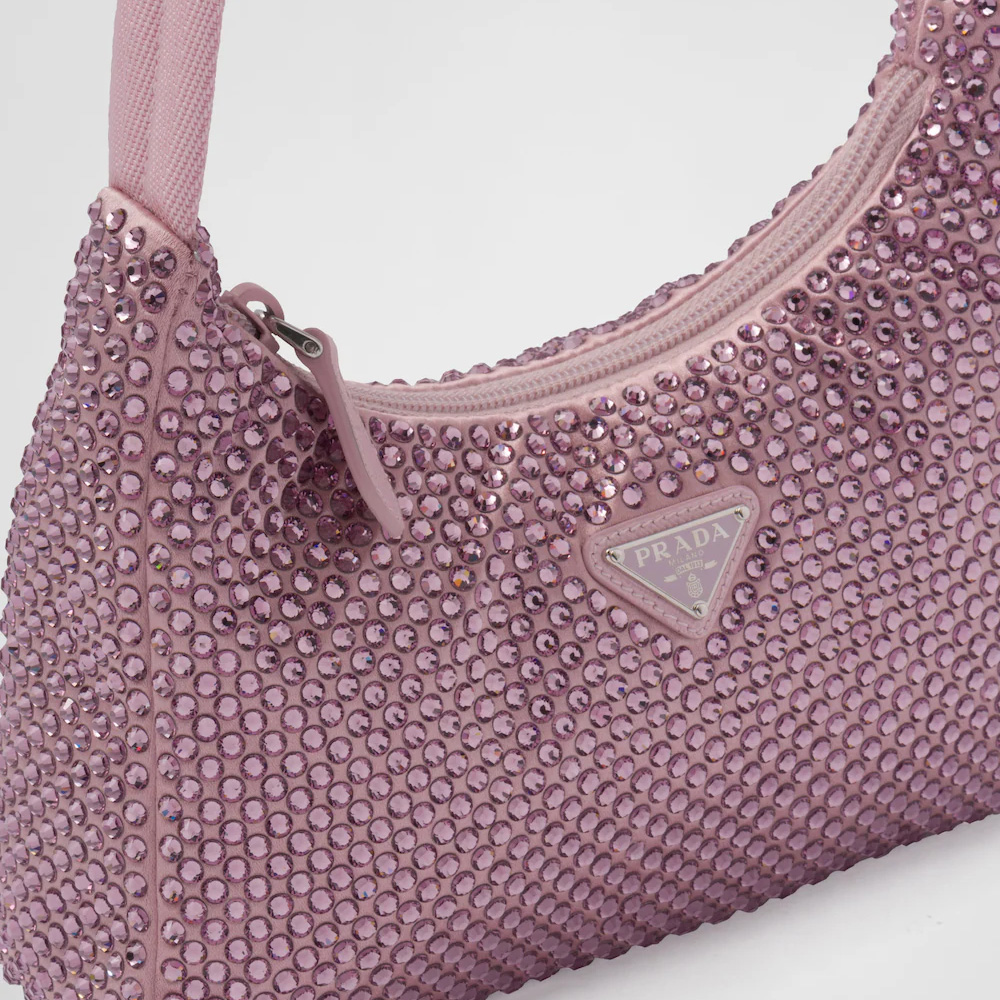 This mini hobo bag, an iconic Prthtada style, comes in a luxurious satin version studded with crystals and decorated with the emblematic enamel triangle logo.