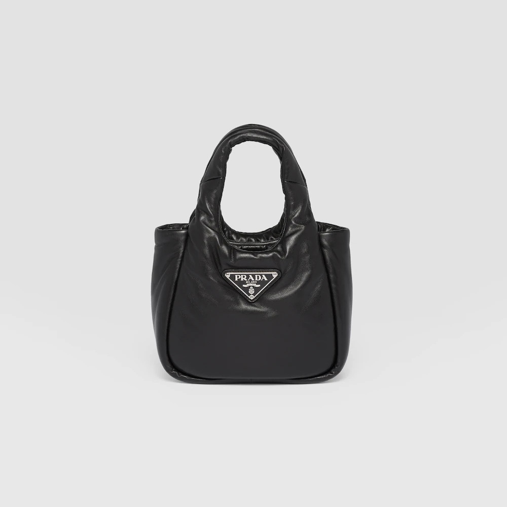 Softness and a simple silhouette define this small handbag made of nappa leather with a padded construction. The tonal triangle logo frames the contrasting lettering logo, creating a textured, three-dimensional contrast that enhances the design of the accessory.