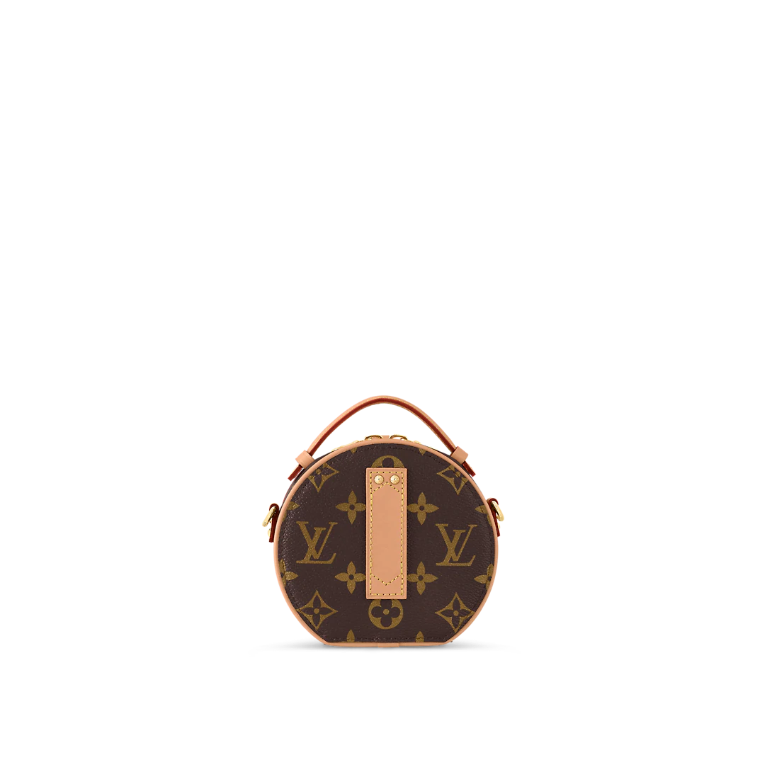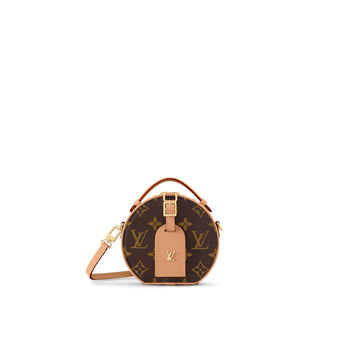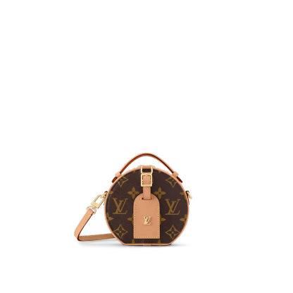 Fashioned from Monogram canvas, the Mini Bo?te Chapeau delights with its iconic shape and classic Lothtuis Vuithttton details such as the leather name tag and interior malletage quilting. The zip closure reveals a well-organized inside with two large gusseted compartments. It can be worn as a belt bag, carried by the handle, on the shoulder thanks to the removable strap.