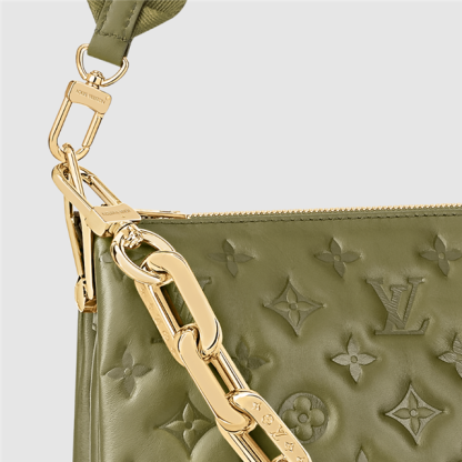The Coussin MM handbag is fashioned from puffy lambskin, embossed with a Monogram pattern. Voluminous, soft, and supple, the bag almost feels like a pillow. An adjustable textile strap allows shoulder and a cross-body carry, while the new Edge Chain, enables under-arm and baguette carry.