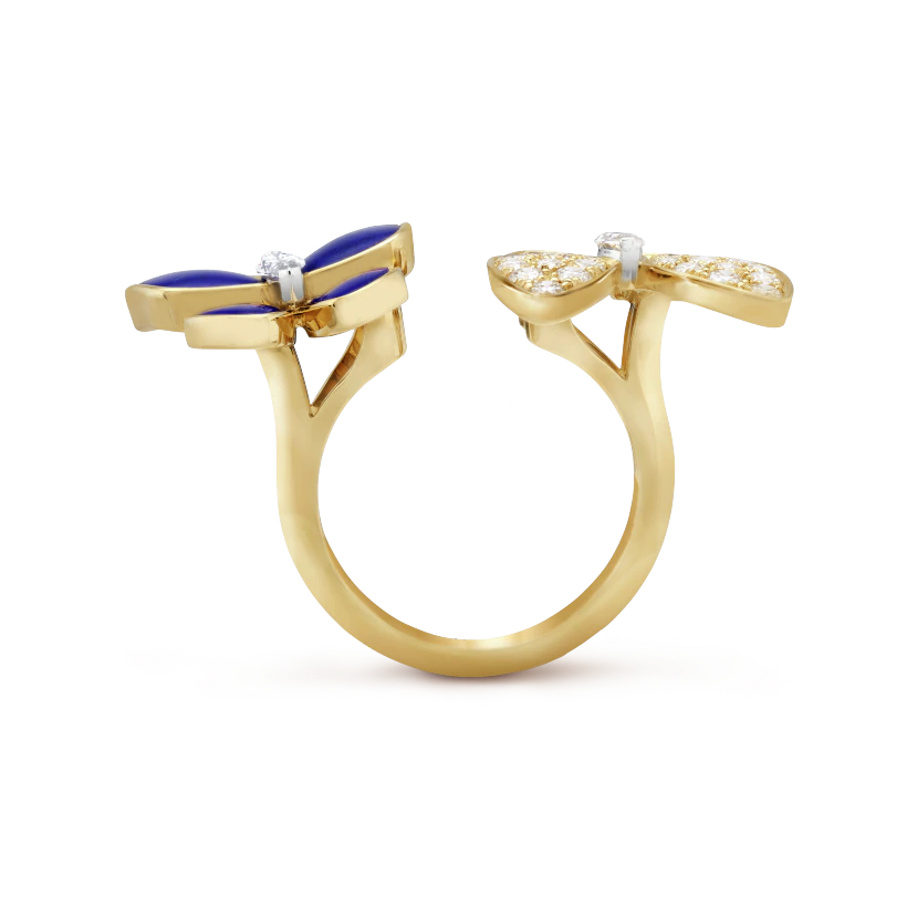 Two Butterfly Between the Finger ring, 18K yellow gold, lapis lazuli, round diamonds, rhodium plated 18K white gold, marquise-cut diamonds; diamond quality DEF, IF to VVS.