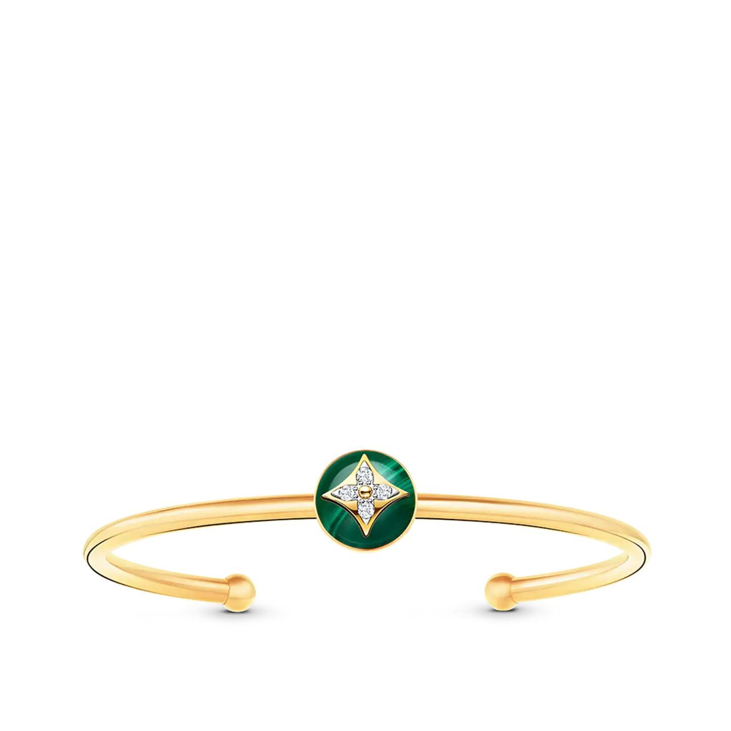 Cast from 18-karat gold, the sleek B Blossom bangle bracelet features a modern, open-band shape. The polished green malachite gemstone is centered with a Monogram Flower motif composed of four superbly cut diamonds. Worn alone, coupled with a B Blossom cuff or stacked with other bracelets, this signature piece lends sparkle and style to any silhouette.