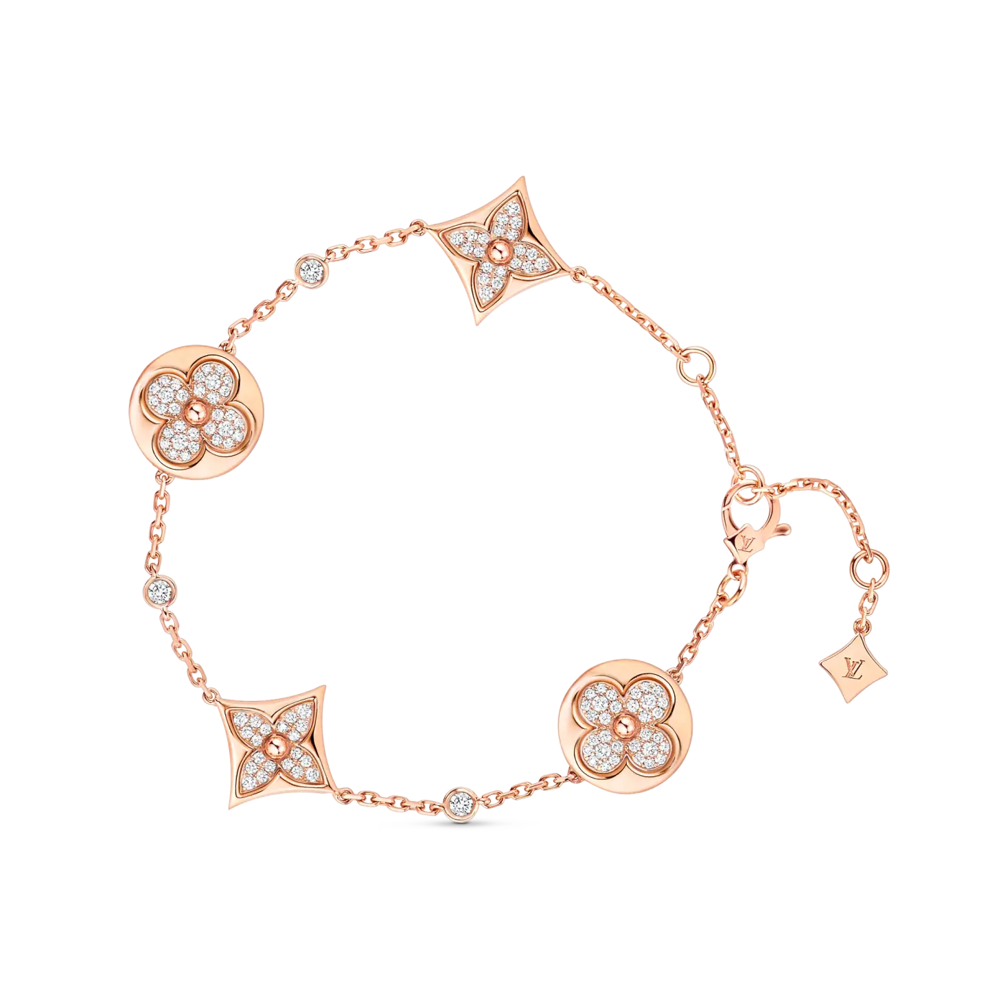 Cast from 18-kt pink gold, the Color Blossom BB bracelet is ornamented with Monogram Flower motifs set with dazzling pavé diamonds. The emblematic sun and star shapes alternate on the adjustable chain with brilliant accent diamonds. This timeless, feminine jewel will complement any look with its precious sparkle.