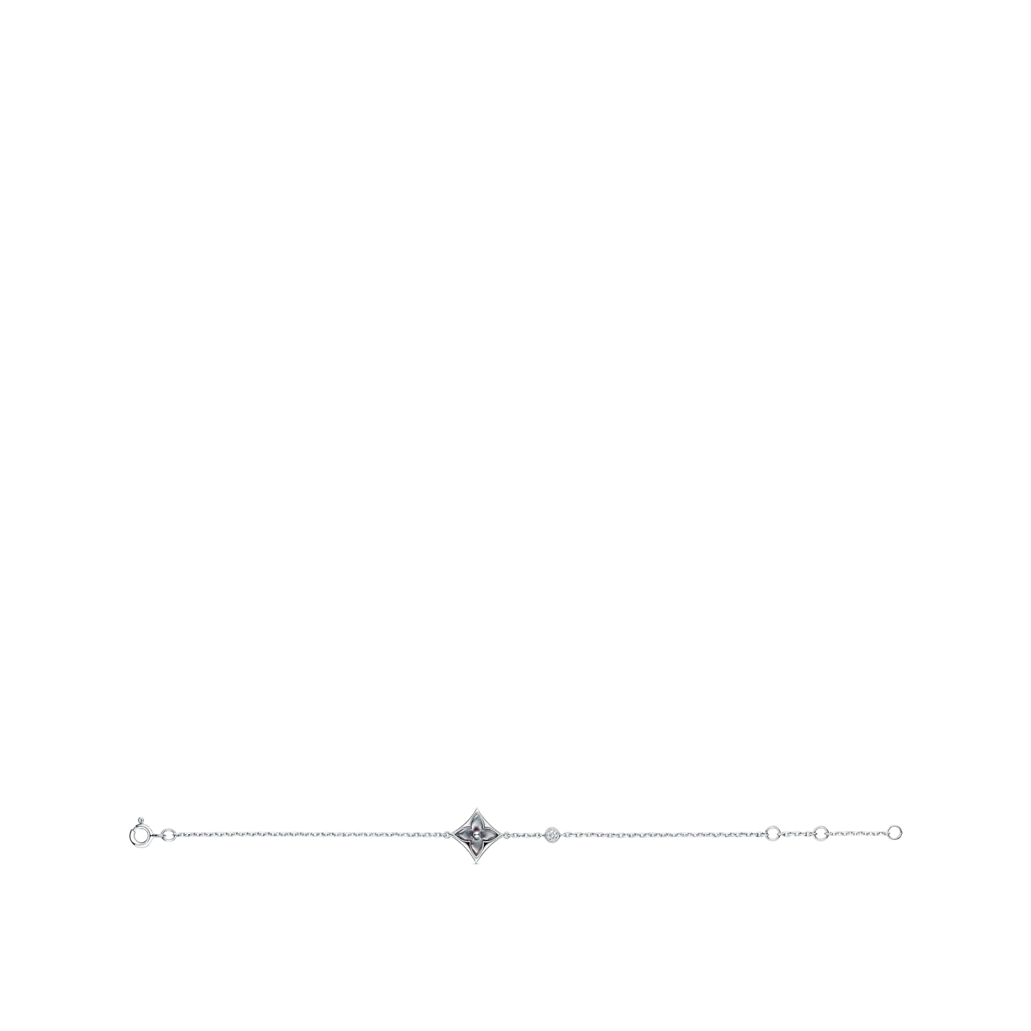 This Color Blossom Star Bracelet in 18-karat white gold is from a fine jewelry collection inspired by the iconic Monogram Flower, created in 1896 by G.-L. Vuithttton. This precious piece features a Star motif carved from natural grey mother-of-pearl, hand-polished to a high gloss and set off by a brilliant round diamond.