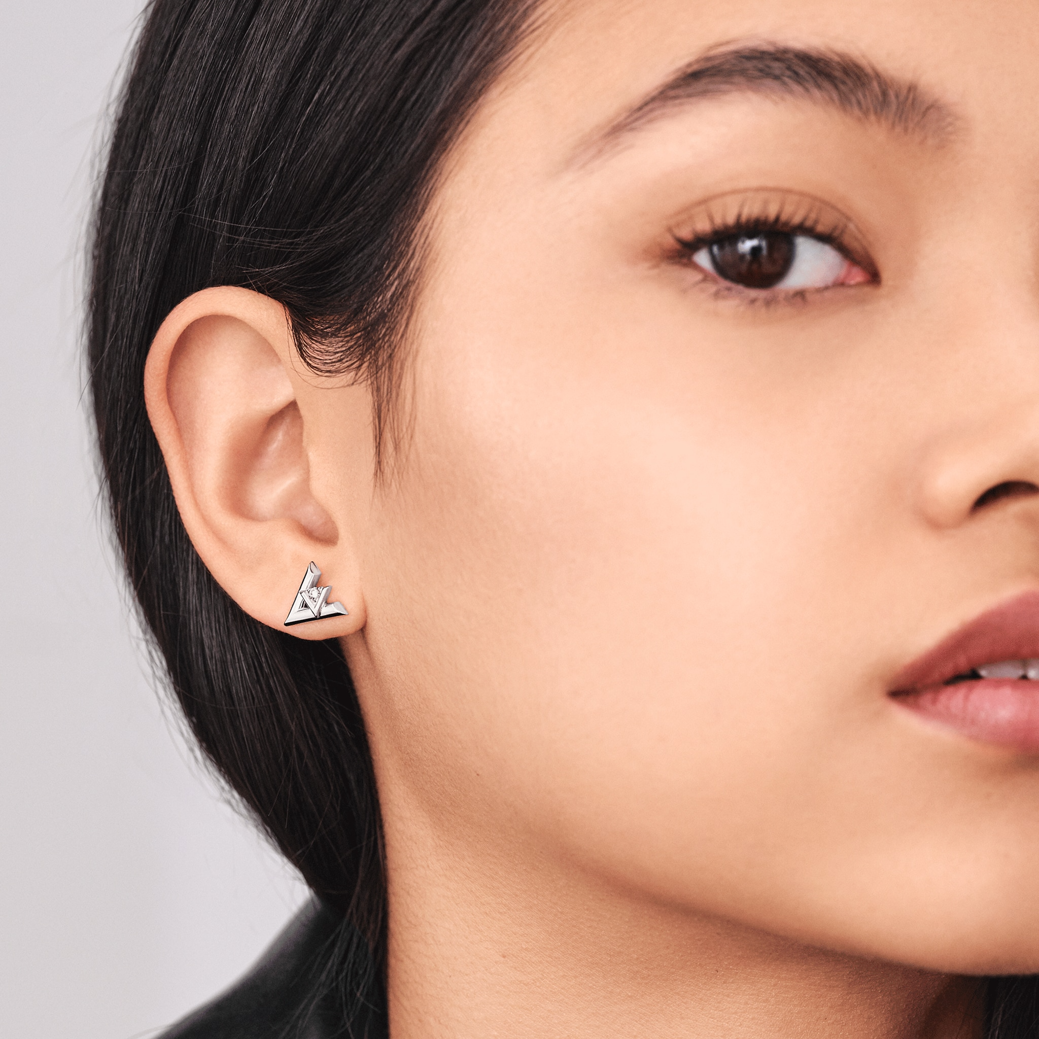 The LthtV Volt ear stud in 18-karat gold offers a striking new interpretation of the iconic LthtV initials, featuring a large L and a smaller V set with a brilliant diamond. The design's sharp slices lend strength and modernity to the signature. It forms part of the LthtV Volt collection for both men and women, whose pieces can be mixed and matched at will.